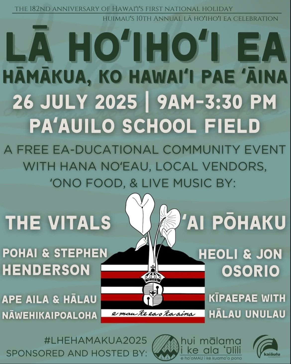 Lā Hoʻihoʻi Ea ma Hāmākua at the Paʻauilo School Field on Saturday, July 26th, 9am-3:30pm. A free ea-ducational community event with hana noʻeau, local vendors, ʻono food, & live music. https://www.alaulili.com/la-hoihoi-ea-hamakua.html