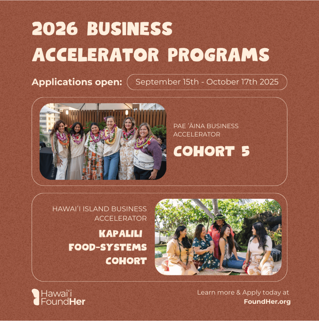 Hawaiʻi FoundHer 2026 Business Accelerator Programs applications are open from Sept. 15th-Oct. 17th. A business accelerator for Native Hawaiian, Asian, and Pacific Islander women founders. https://www.foundher.org