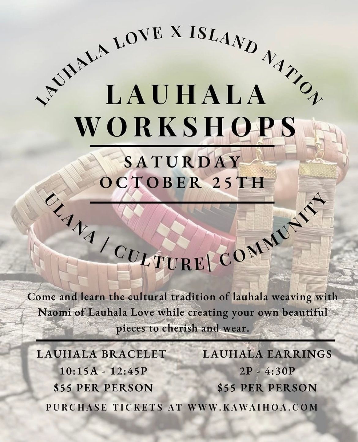 Lauhala Workshops: Lauhala Love x Island Nation on Sat Oct. 25th, 10:15am-12:45pm. Ulana, culture, community. Learn the cultural tradition of lauhala weaving with Naomi of Lauhala Love while creating your own pieces to cherish and wear. Purchase tickets at kawaihona.com