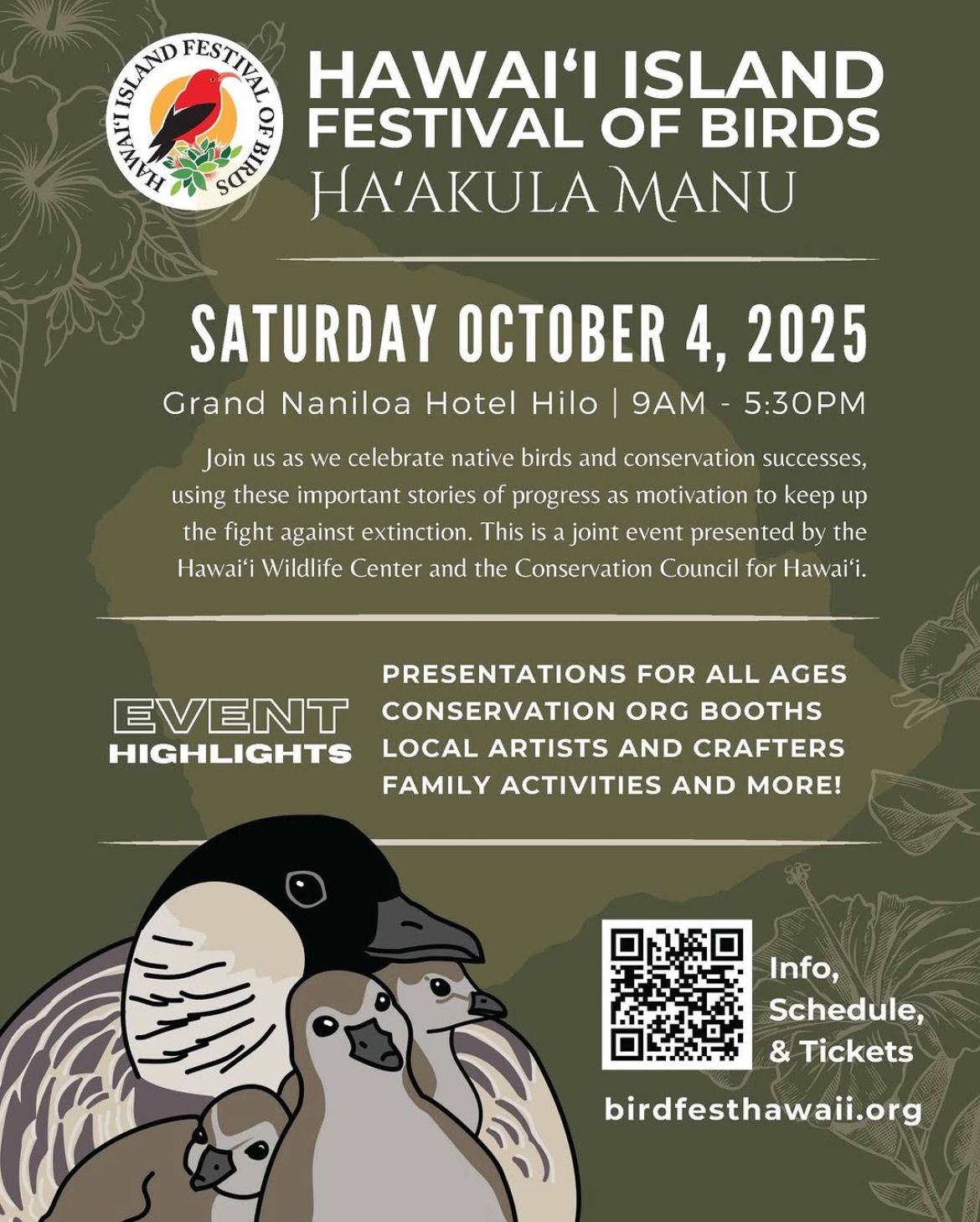 Hawaiʻi Island Festival of Birds: Haʻakula Manu on Sat Oct. 4th, 9am-5:30pm at the Grand Naniloa Hotel Hilo. Presentations for all ages, conservation org booths, local artists and crafters, family activities, and more! Find info, schedule, and tickets at birdfesthawaii.org