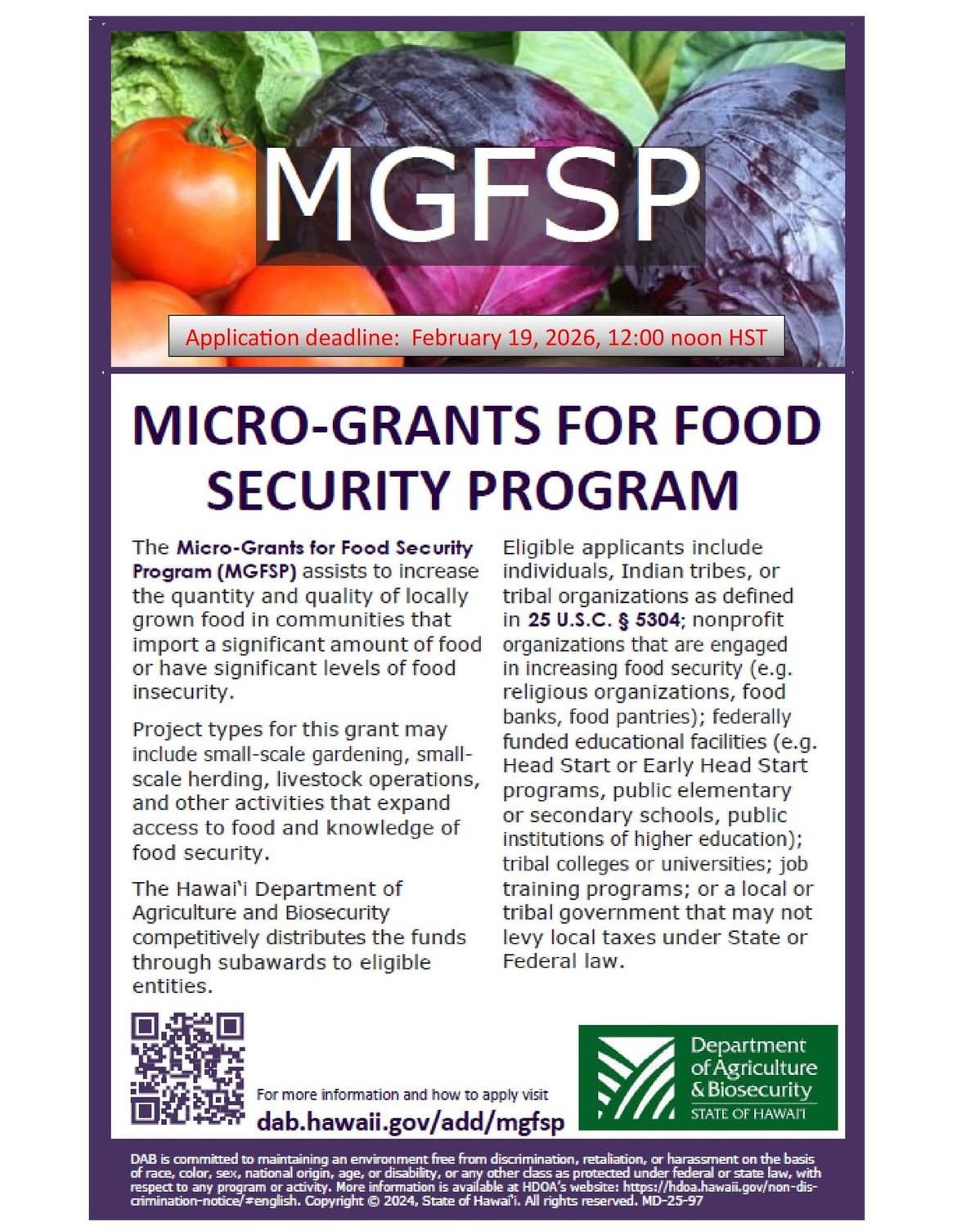 GoFarm Hawai'i Open House on Sat Jan. 31st, 9-11am at their 'Alae Hawai'i Island Training Site. Student-run farm stand so you can have an opportunity to support the current cohort’s farm journey. Curious about farmer training programs or looking to collaborate? Register for free at https://gofarmhawaii.org