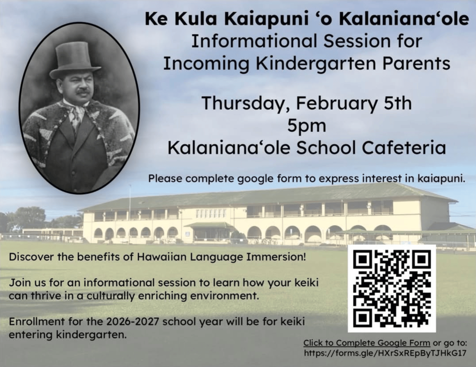 Ke Kula Kaiapuni 'o Kalaniana'ole Informational Session for Incoming Kindergarten Parents on Thurs Feb. 5th, 5pm at Kalaniana'ole School Cafeteria in Pāpaʻikou. If interested fill out this form