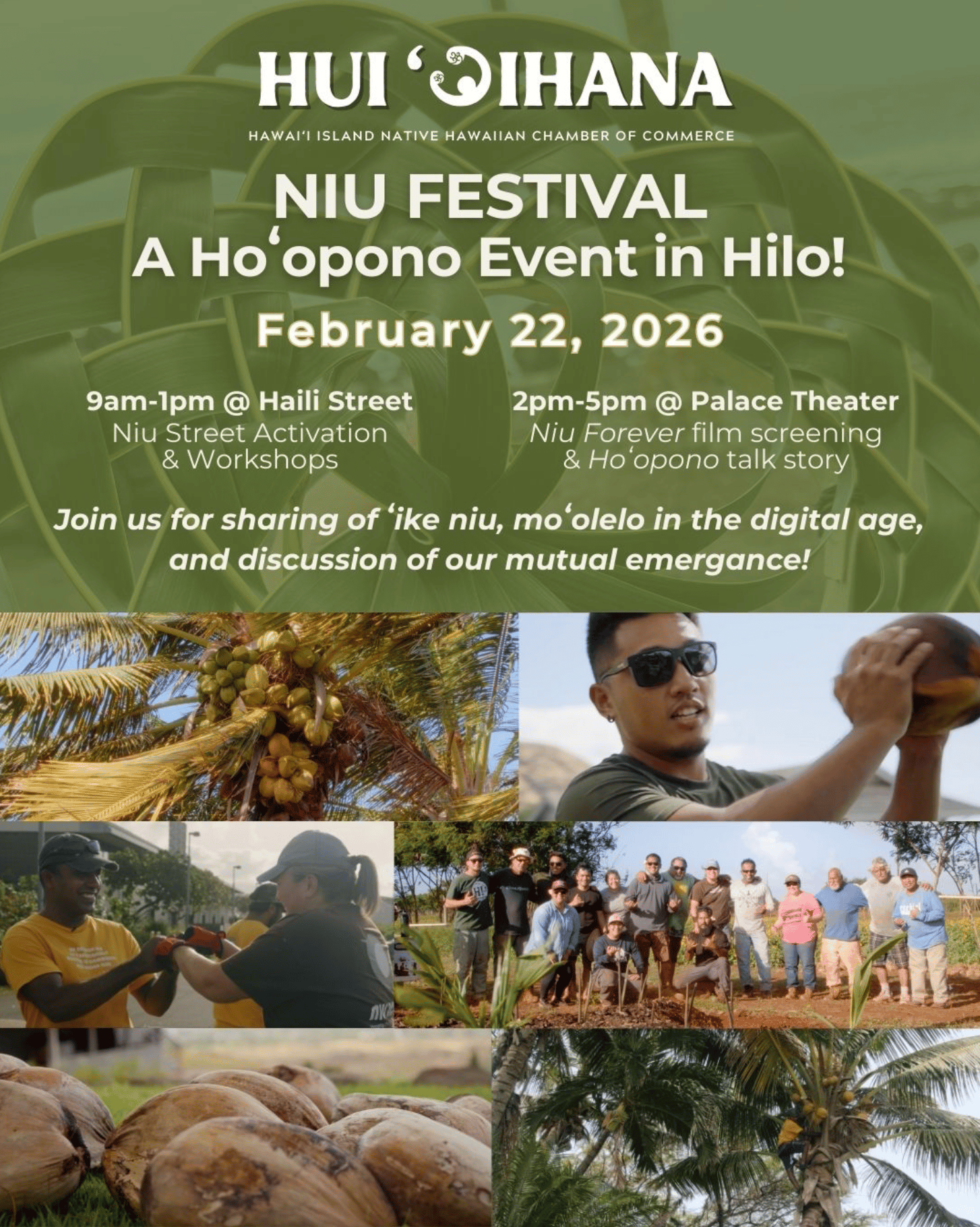 Niu Festival on Sun Feb. 22nd, 9am-1pm @ Haili St: Niu Street Activation and Workshops: Papale weaving, niu grating, drum-making, niu variety & stage identification, digital niu storytelling workshop + 2-5pm @ Palace Theater: Niu Forever film screening & Ho'oponopono talk story. Join for sharing of 'ike niu, mo'olelo in the digital age, and discussion of our mutual emergence. RSVP for the film screening at https://hilopalace.com/palace-event/niu-forever/