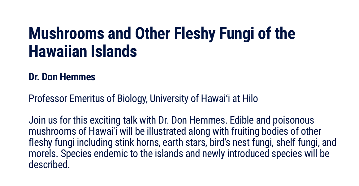 TCBES Speaker Series: Mushrooms and Other Fleshy Fungi of the Hawaiian Islands w/ Dr. Don Hemmes on Thurs Jan. 29th, 3:30-4:30pm at ʻImiloa Planetarium. Reserve your spot for this free event here