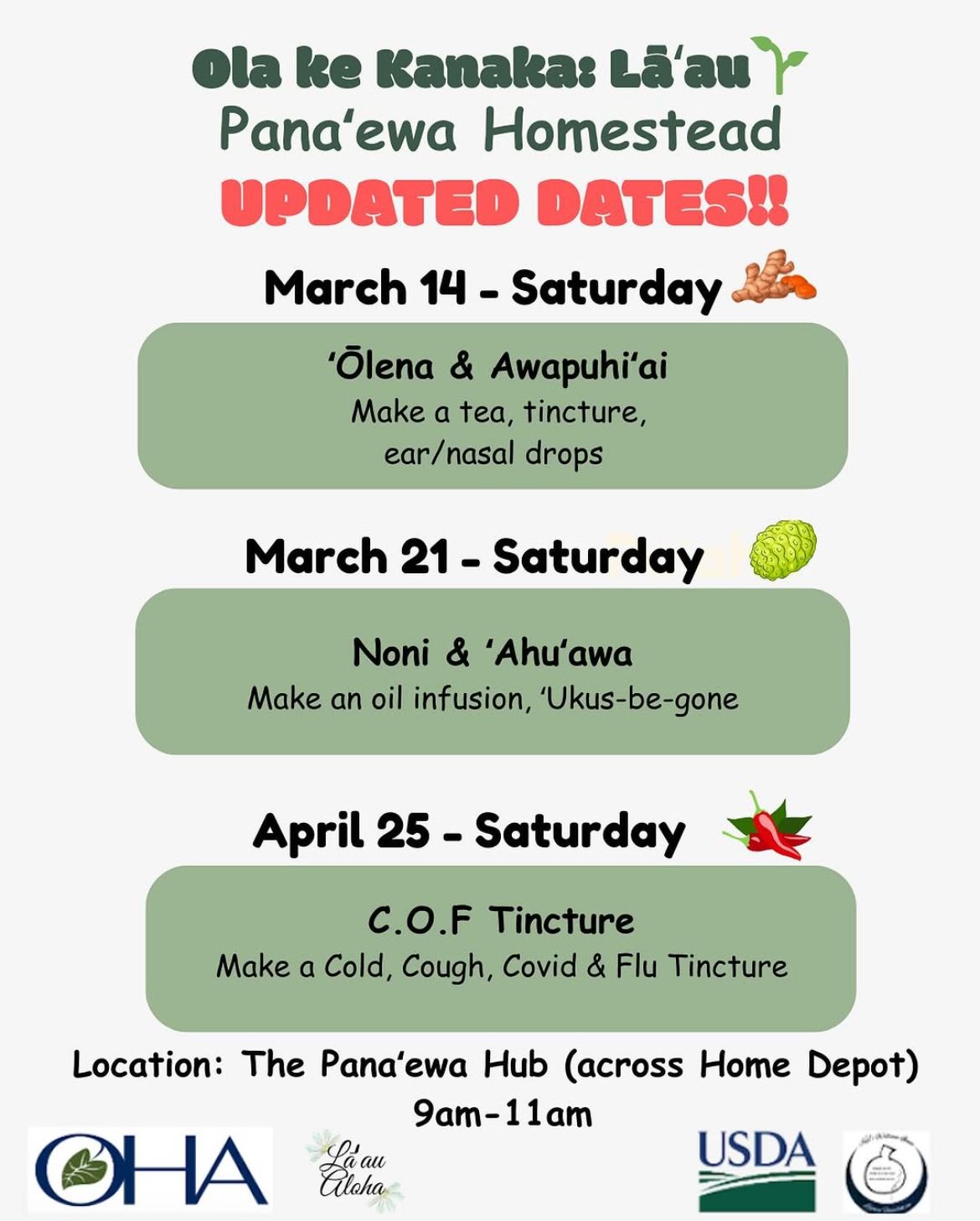 Ola Ke Kanaka Health Series: Lāʻau Lapaʻau - Pana’ewa Homestead - on Saturdays 9-11am, March 14th, March 21st, April 25th at Pana’ewa Hub (behind Home Depot). Homestead residents are priority. Please help spread the word! Heal your ʻohana with lāʻau that grow all around us. Make long lasting medicines to add to your first aid kit and medicine cabinet. ʻOhana and keiki welcome! Learn about Ola Ke Kanaka and register for free here