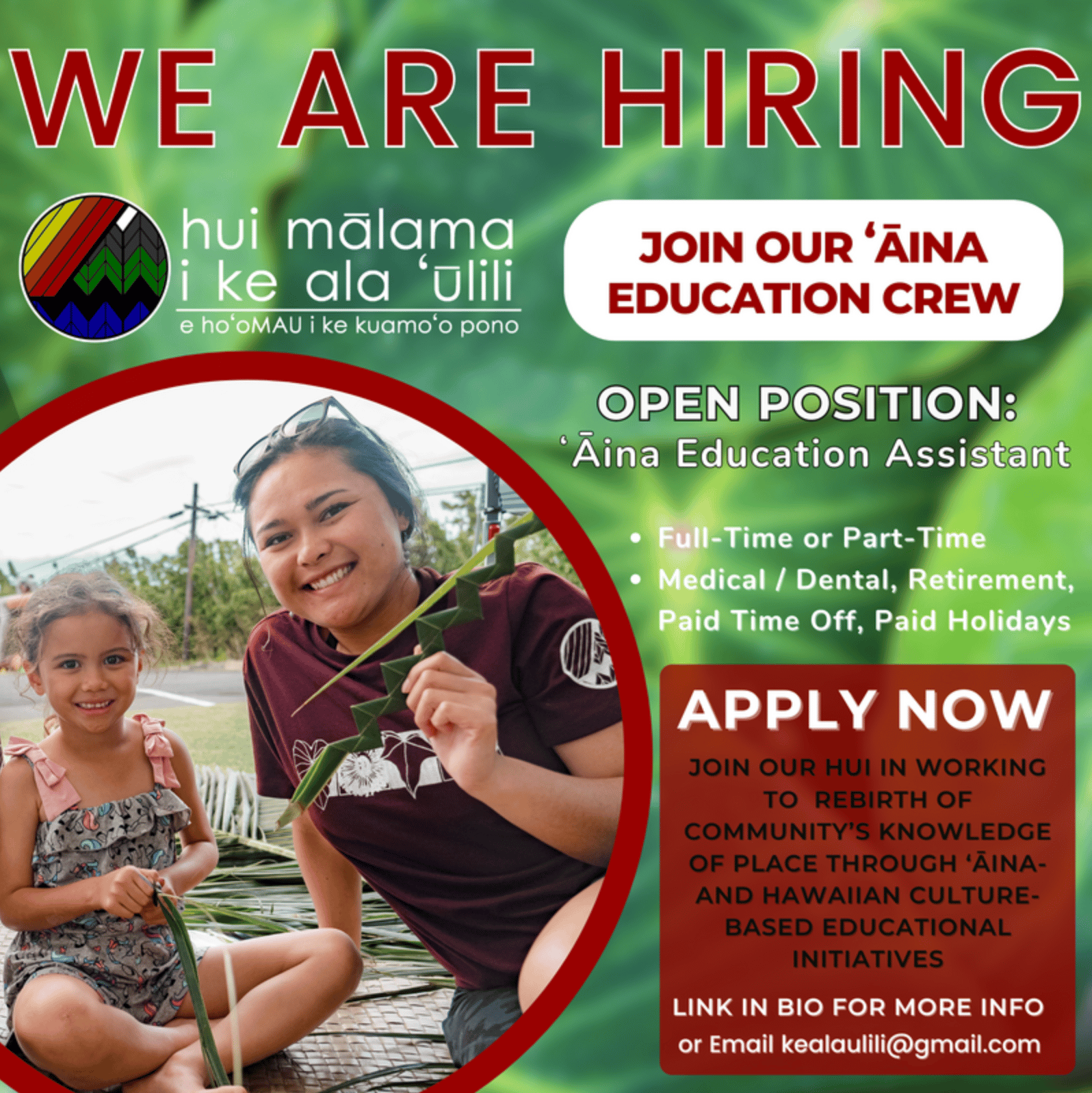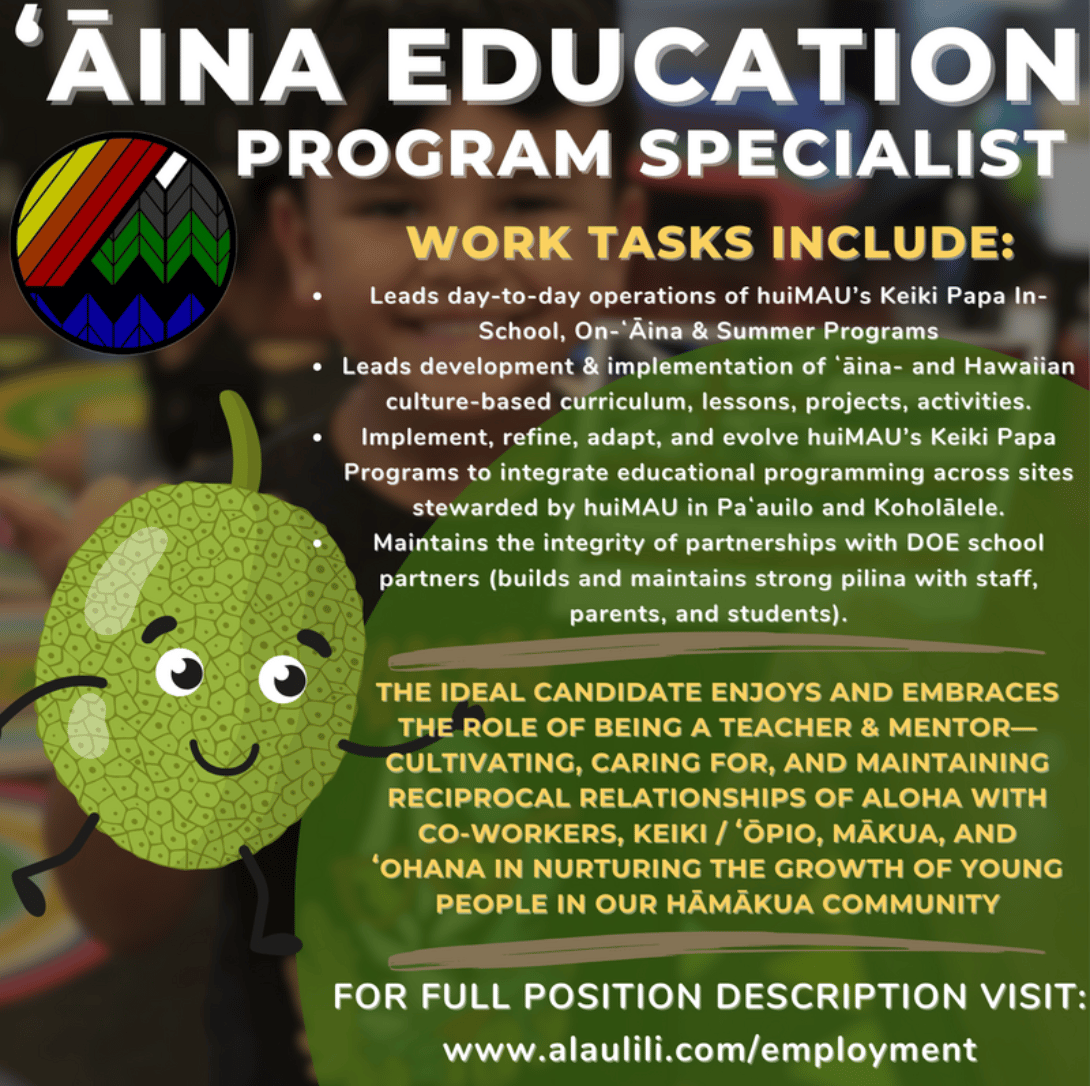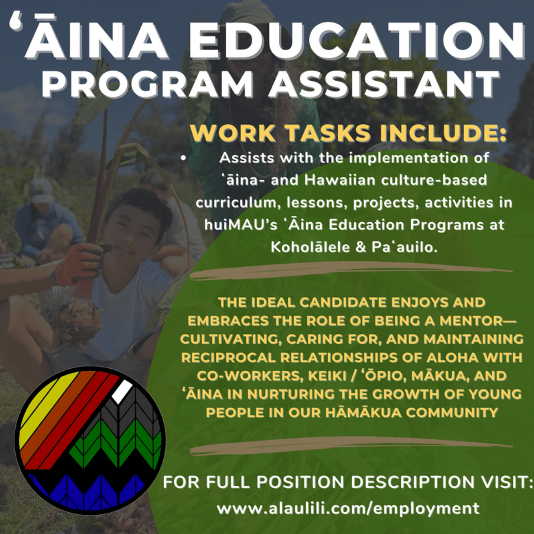huiMAU has 2 open positions: ʻĀina Education Program Specialist & ʻĀina Education Program Assistant. Join Hui Mālama i ke Ala ʻŪlili in working to re-establish the systems that sustain communities. Apply here or email [email protected].