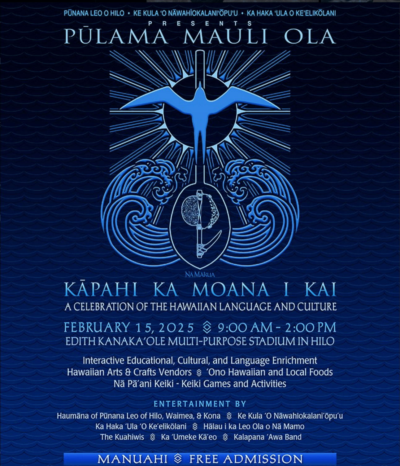 Pūlama Mauli Ola. Kāpahi Ka Moana I Kai: A celebration of the Hawaiian language and culture. Saturday, February 15, 2025. 9am-2pm. Edith Kanakaʻole Multi-Purpose Stadium in Hilo. Free Admission.