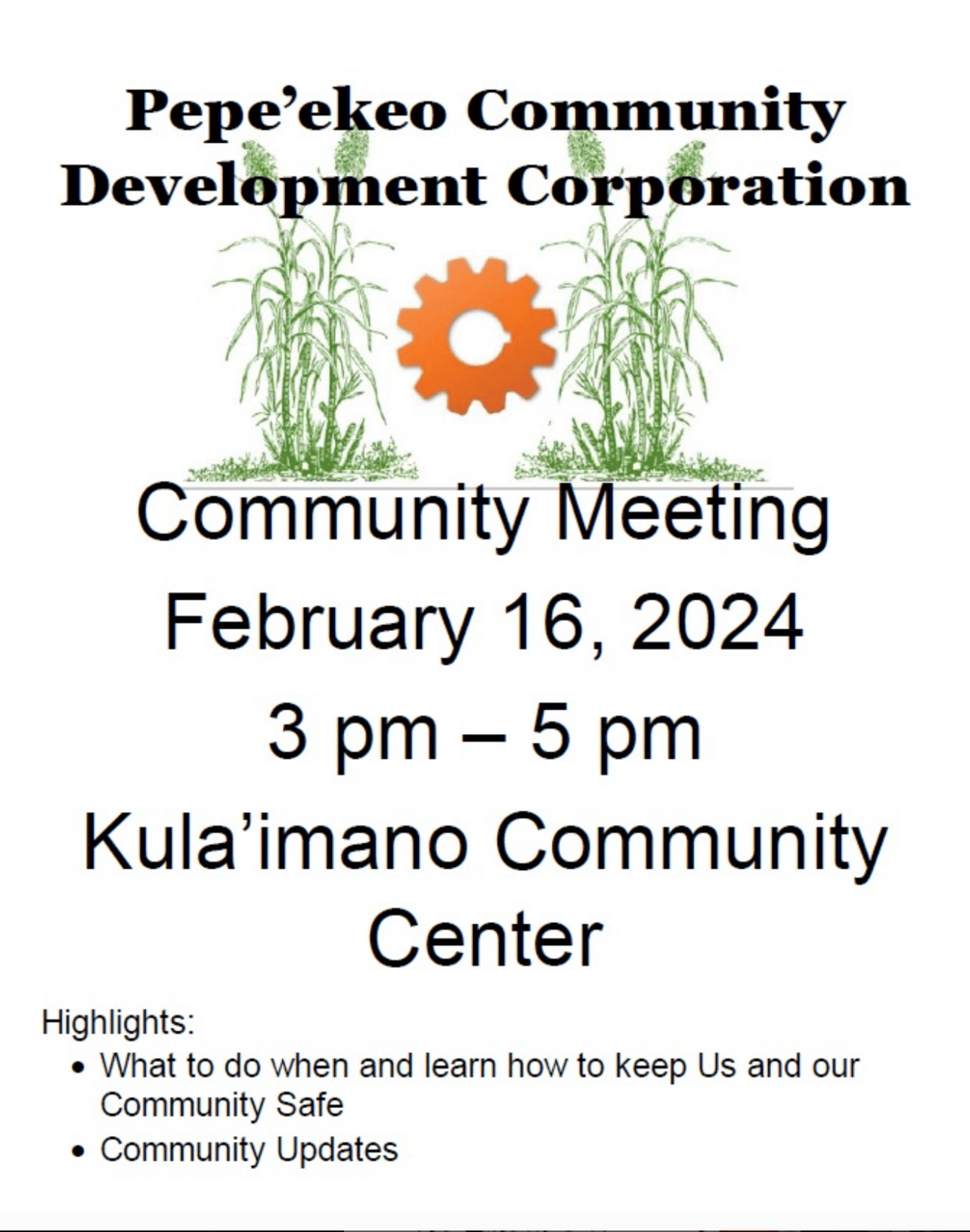 Pepeʻekeo Community Meeting at 3PM on Sunday, February 16, 2025 at Kulaʻimano Community Center pepeekeocommunity.org