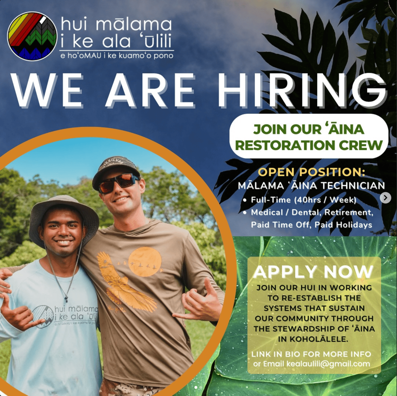huiMAU is hiring a Mālama ʻĀina Technician. Join their ʻĀina Restoration Crew. https://www.alaulili.com/employment