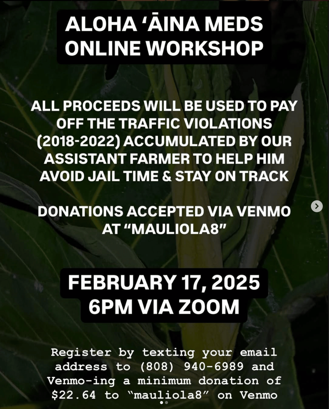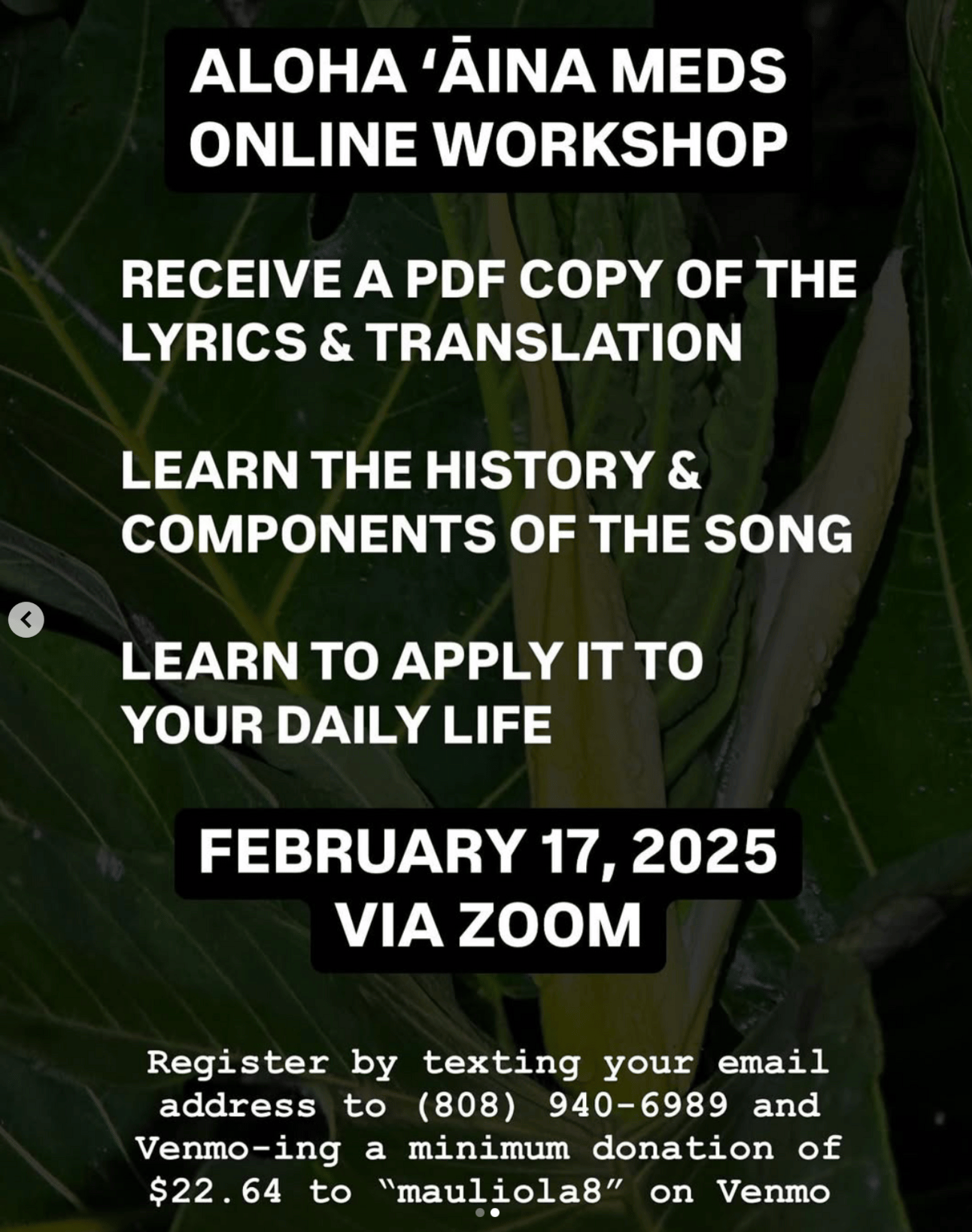 Learn the depth of the mele, Aloha ʻĀina Meds, with Kuʻulei Music. Workshop at 6PM on Monday, February 17th, 2025 via Zoom. Help raise funds to keep her ʻOhana kākoʻo mahiʻai on their ʻĀina Aloha. Find more information at instagram.com/kuuleimusic and register for workshop by texting your email address to (808) 940-6968 and Venmo a minimum donation of $22.64 to mauliola8.