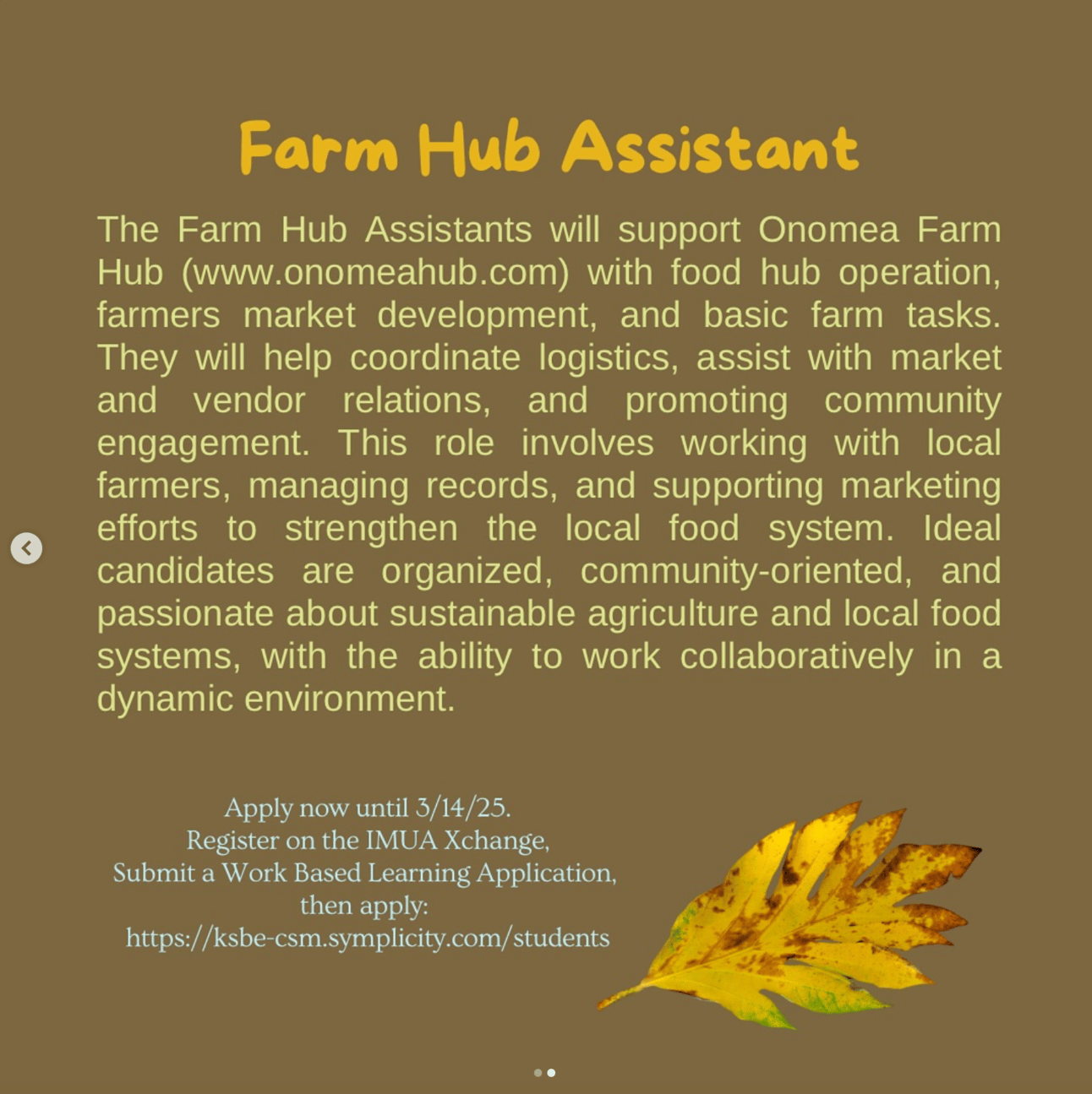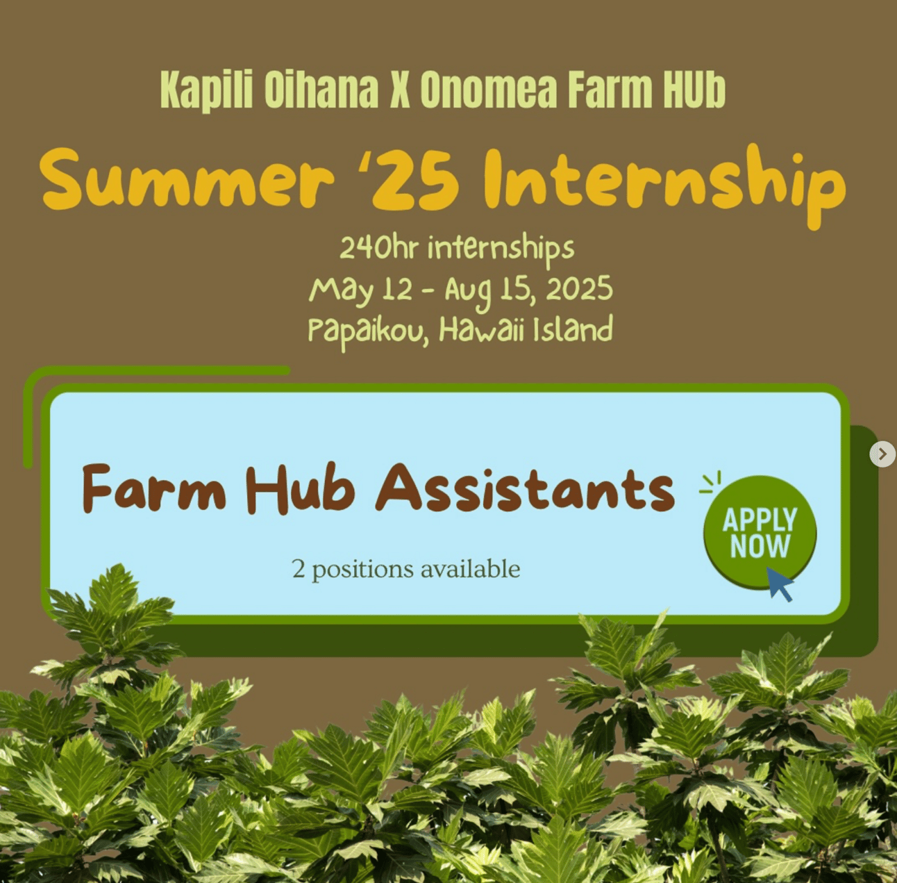 Onomea Farm Hub is offering 2 internship positions through the Kapili Oihana program. Apply by March 14th, 2025. Find more information at instagram.com/onomeahub and in the photos below. Interested candidates can apply at linktr.ee/onomeahub