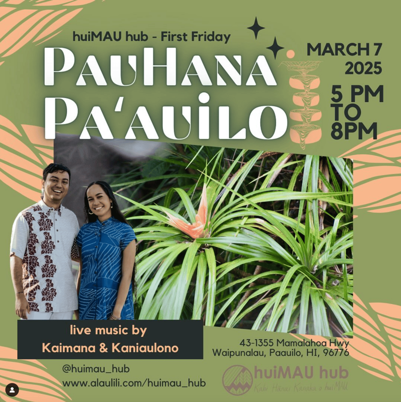 First Friday Pau Hana on March 7th 5pm-8pm at Hui Mālama I Ke Ala ʻŪlili - huiMAU hub in Paʻauilo. Find more info at alaulili.com and instagram.com/huimau_hub