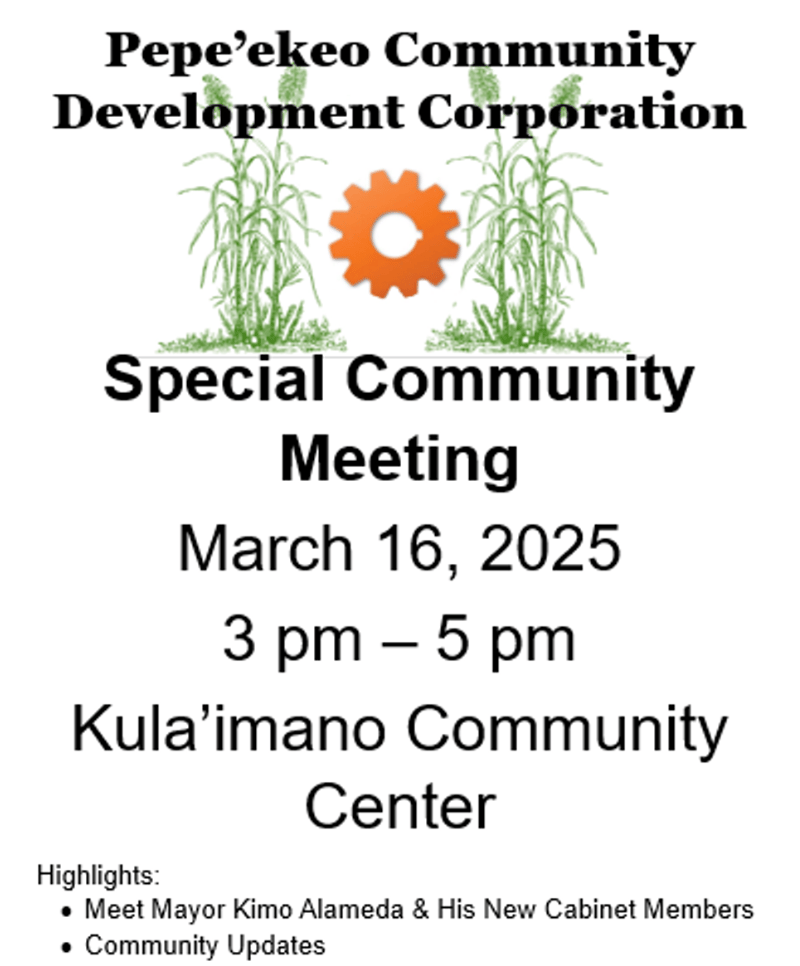 Pepeʻekeo Community Meeting at 3-5PM on Sunday, March 16, 2025 at Kulaʻimano Community Center pepeekeocommunity.org