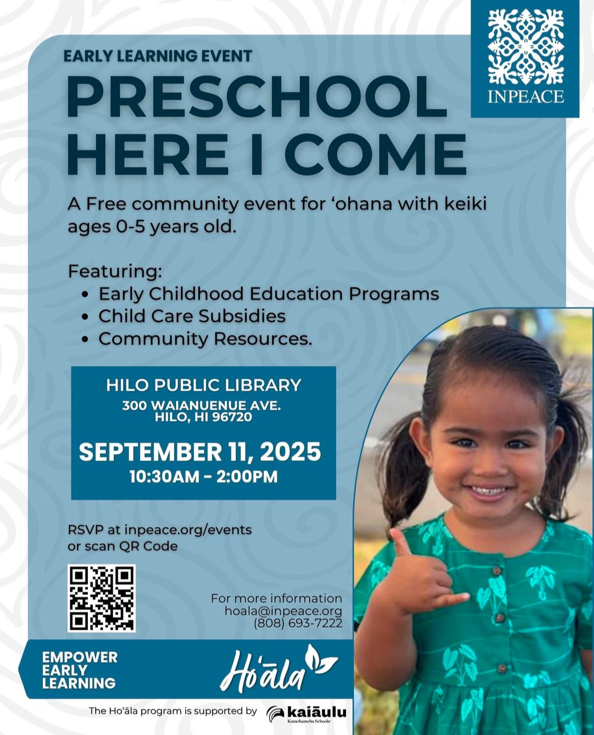 Early Learning Event: Preschool Here I Come w/ INPEACE Hawaiʻi at the Hilo Public Library on Thurs Sept. 11th from 10:30am-2pm. RSVP at inpeace.org/events Free community resources event for ʻohana with keiki ages 0-5 years old.