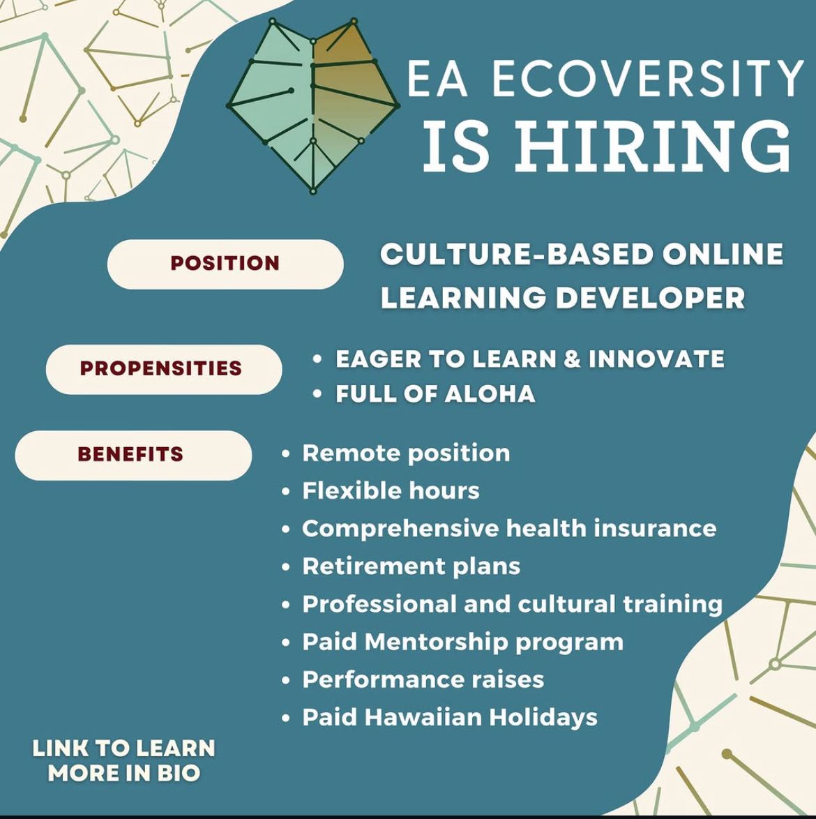 EA Ecoversity is hiring a culture-based online learning developer. Apply at https://docs.google.com/forms/d/e/1FAIpQLSeE9rHf-Eefaxzq_pLfS0iPUN-ddNZ9CteGKgdcK8tKXMXUZg/viewform and find more info at https://www.kuakanaka.com/eaecoversity