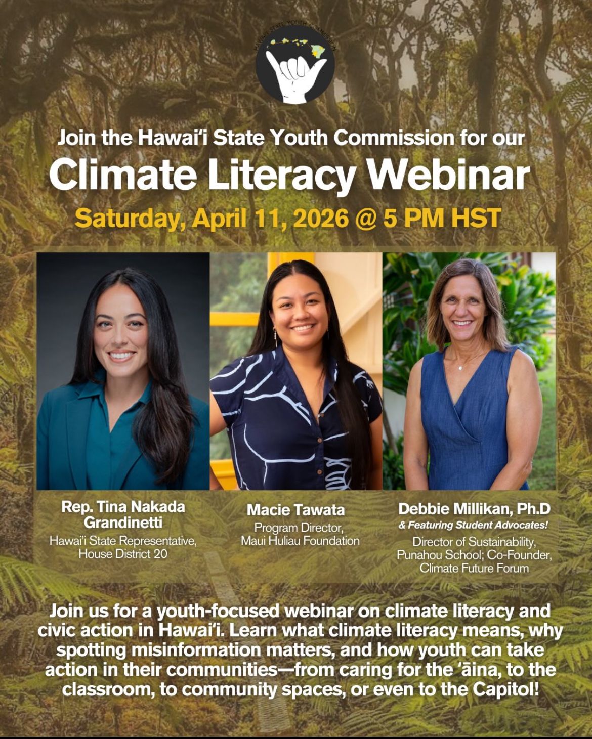 Climate Literacy Webinar on Sat, April, 11th, 5pm via Zoom. Join the Hawaiʻi State Youth Commission for a youth-focused conversation on climate literacy and civic action in Hawaiʻi. Open to students, educators and community, with priority given to students. No prior advocacy experience needed. RSVP here by April 8th