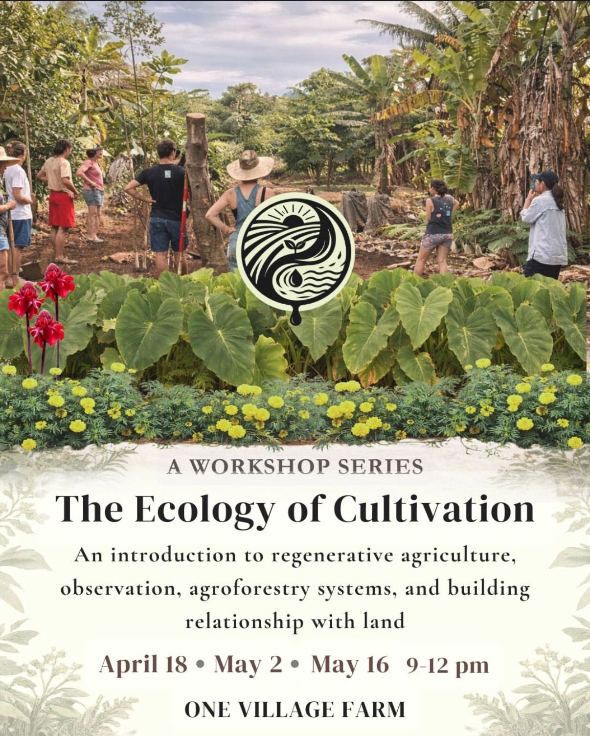 The Ecology of Cultivation Workshop Series on April 18th, May 2nd, & May 16th at One Village Farm. An introduction to regenerative agriculture, observation, agroforestry systems, and building relationship with land. Find more info & register here