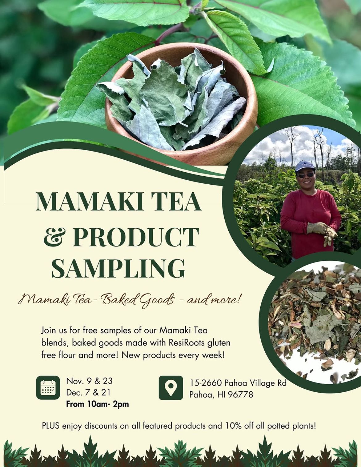 Mamaki Tea & Product Sampling at Waiholokuʻi Garden Store on Nov. 9th & 23rd and Dec. 7th & 21st from 10am-2pm.