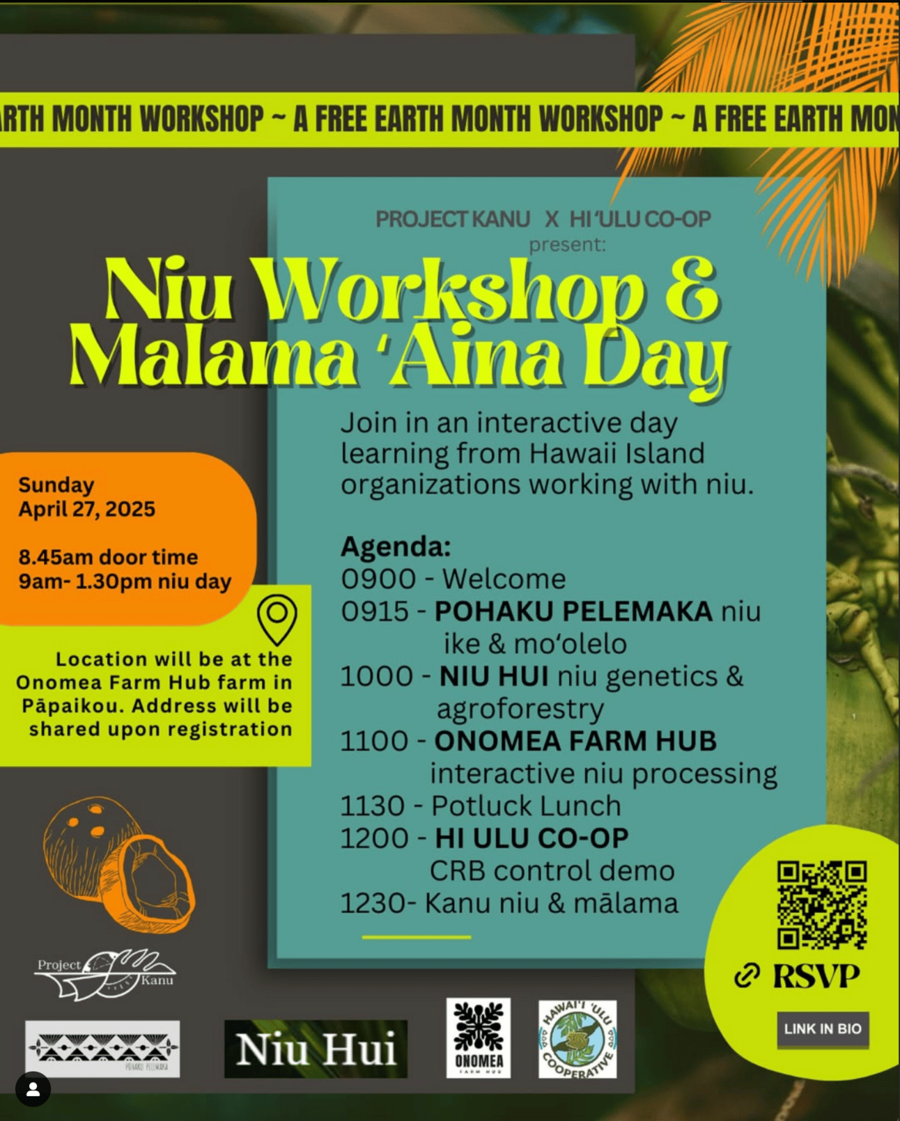 Niu Workshop & Malama ʻĀina Day on April 27th from 9am-1:30pm at the Onomea Farm Hub farm in Papaikou. Join in an interactive day learning from Hawaiʻi Island organizations working with niu. Register at https://forms.gle/pPVyS9gMZErV1qqB7 & find more info at https://www.projectkanu.org/cultivate