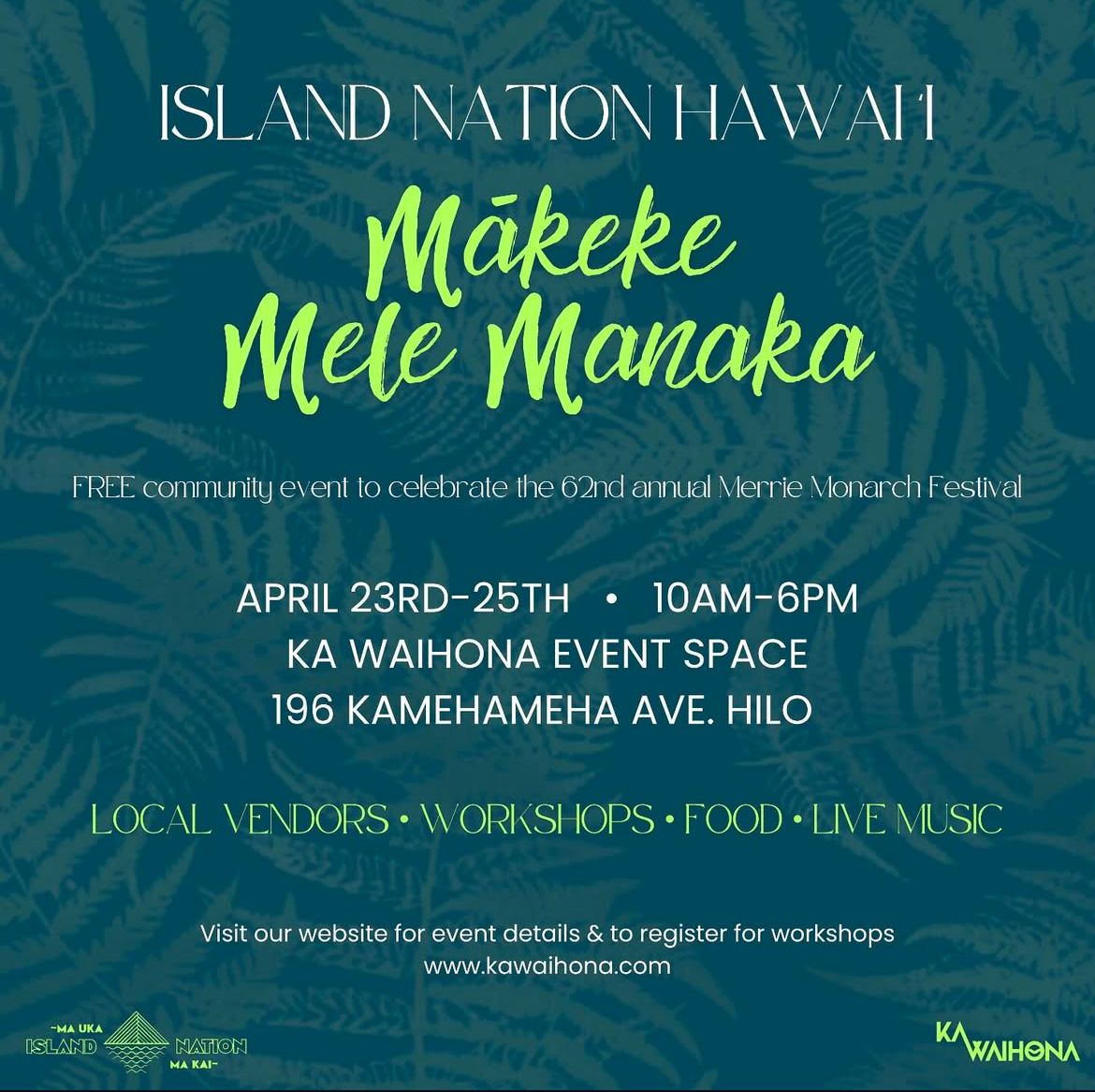 Mākeke Mele Manaka at Island Nation Hawaiʻi on April 23rd-25th from 10am-6pm. Local vendors, workshops, food, live music. Register for workshops at https://www.kawaihona.com