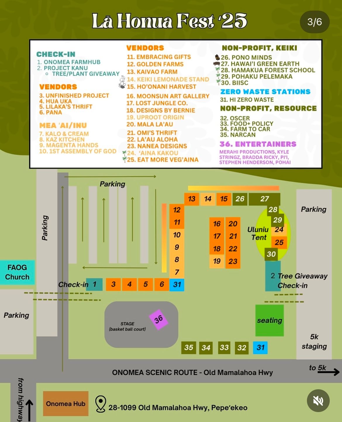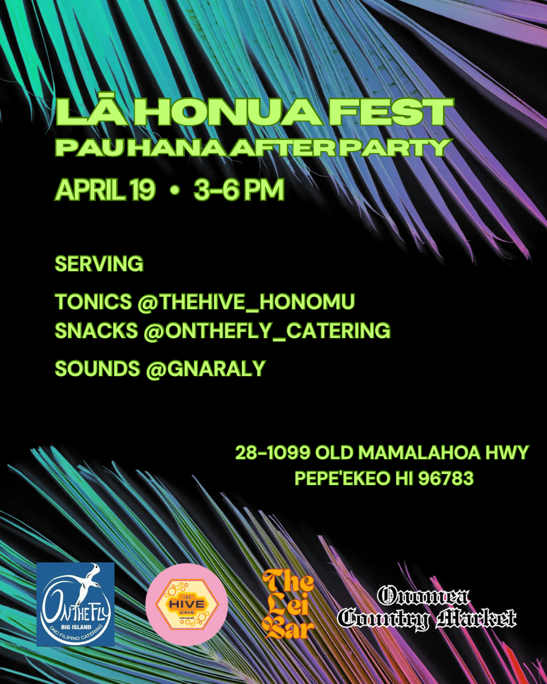 Happening now! in Pepeʻekeo Park. The scenic 5k walk/run finished up this morning; join us now for the market with food & craft vendors, educational booths, keiki activities, and live music. Celebrating sustainability and community. Then head over across the street to Onomea Hub for the Pau Hana after party from 3-6pm with tonics from The Hive, alcoholic beverages from Onomea Country Market, ʻono filipino food from On The Fly Catering, live music with Piʻikea Jack, and sounds with DJ Nara.